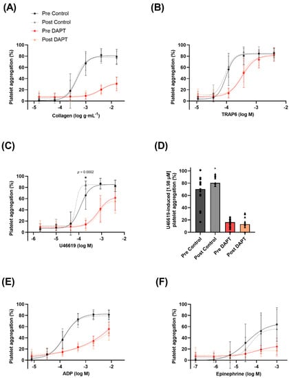 Basal platelet reactivity (expressed as platelet aggregation (%)) to 6 concentrations of the platelet agonists before and after 8 weeks of exercise training with and without dual anti-platelet therapy (DAPT): (A) collagen, (B) thrombin receptor activator peptide 6 (TRAP6), (C) U46619 (U4), (D) U46619-induced aggregation at (1.98 µM), (E) adenosine 5′-diphosphate (ADP), and (F) epinephrine. *, indicates a statistically significant increase compared with pre-training (n = 13 for all agonists).