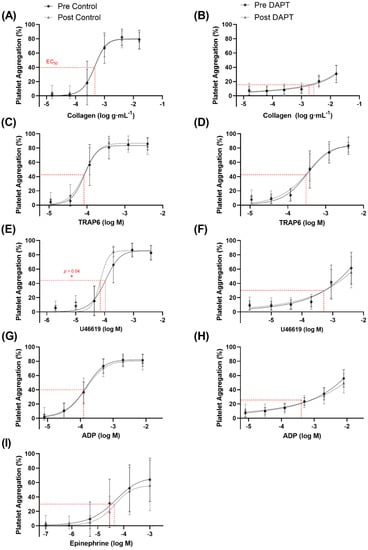The half maximal effective concentration (EC50) for platelet aggregation with (B,D,F,H) or without (A,C,E,G,I) dual anti-platelet therapy (DAPT): (A) collagen, (B) collagen with DAPT, (C) thrombin receptor activator peptide 6 (TRAP6), (D) TRAP6 with DAPT, (E) U46619, (F) U46619 with DAPT, (G) ADP, (H) ADP with DAPT, and (I) epinephrine. *, indicates a statistically significant decrease with training (n = 13 for all agonists).