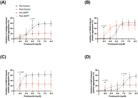 Platelet sensitivity to the anti-aggregatory effects of prostacyclin (1–300 nM), with and without dual anti-platelet therapy (DAPT). Agonist-induced platelet aggregation to (A) 10 µg∙mL−1 collagen (n = 12), (B) 10 µM thrombin receptor activator peptide 6 (TRAP6) (n = 13), (C) 20 µM adenosine 5′-diphosphate (ADP) (n = 12), and (D) 10 µM U46619 (n = 12). *, indicates a statistically significant decrease with training with the control treatment. #, indicates a statistically significant decrease with training with the DAPT treatment.