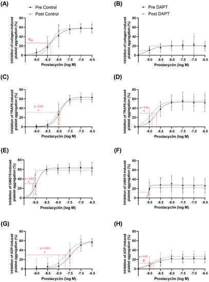 The half maximal inhibitory concentration (IC50) for inhibition of platelet aggregation by prostacyclin (1–300 nM) with (B,D,F,H) or without (A,C,E,G) dual anti-platelet therapy (DAPT). (A) collagen (n = 12), (B) collagen with DAPT (n = 12), (C) thrombin receptor activator peptide 6 (TRAP6; n = 13), (D) TRAP6 with DAPT (n = 13), (E) U46619 (n = 12), (F) U46619 with DAPT (n = 12), (G) adenosine 5′-diphosphate (ADP) (n = 12), and (H) ADP with DAPT (n = 12). *, indicates a statistically significant decrease with training. $, indicates a trend for a decrease with training.
