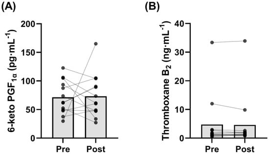 Plasma levels of (A) 6-keto prostaglandin F1α (6-keto PGF1α) (p = 0.895) and (B) thromboxane B2 (p = 0.579) measured pre- and post-training (n = 13).