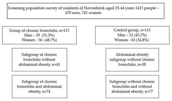 Chronic bronchitis (CB), according to the clinical recommendations of the Russian Respiratory Society of 2021, was established on the basis of anamnesis: the presence of cough and sputum production for at least 3 months in each of two consecutive years in the absence of other pathology of the bronchopulmonary system (tuberculosis, bronchiectasis, pneumonia, asthma, lung cancer, etc.), causing “cough history”. Abdominal obesity (AO) was determined based on waist circumference > 80 cm in women and > 94 cm in men [8].