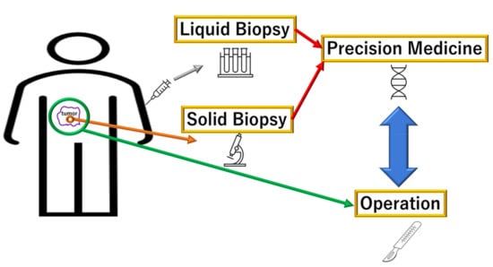 Biopsy procedure for precision therapy against pancreatic ductal adenocarcinoma (PDAC). The characteristics of tumors can be obtained by liquid and solid biopsy. Blood sampling and needle biopsy are performed to obtain liquid samples, whereas surgery, endoscopic approach, and needle biopsy, in some cases, are conducted to examine solid samples. The information obtained from liquid and solid biopsies will contribute to precision medicine. A multifaceted approach may improve patient prognosis in intractable cancers (e.g., PDAC).