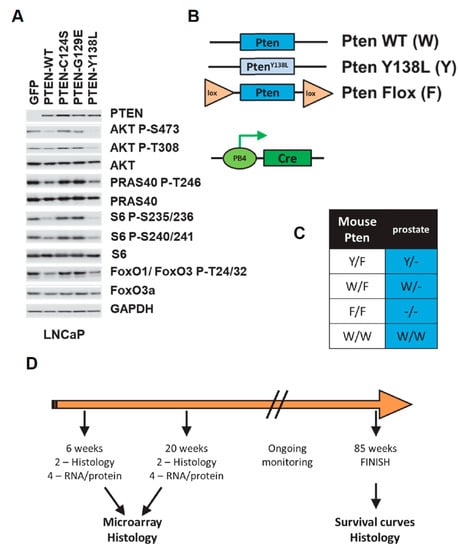 (A) Unselected LNCaP cells transiently expressing green fluorescent protein (GFP) or the indicated PTEN proteins were analysed by immunoblotting with the indicated antibodies. Quantitation of this data is shown in Supplementary Figure S2. (B–D) The study plan uses 2 mutant Pten alleles, a constitutive PtenY138L allele and a copy of Pten flanked by loxP recombination sites (Flox or F) which can be deleted upon expression of the exogenous Cre recombinase. These are represented alongside the wild-type (WT) gene. The PB4-Cre transgene which expresses Cre specifically in the post-natal prostate-epithelium from a modified probasin promoter is also represented. (C) The four experimental genotypes used in the study are represented. F represented the undeleted loxP-flanked Pten gene copy which is fully functional until deleted by Cre specifically during prostate development. (D) Groups of mice were sacrificed for tissue at 6 weeks and 20 weeks of age whilst a further cohort were monitored for tumour formation up to the age of 65 weeks.