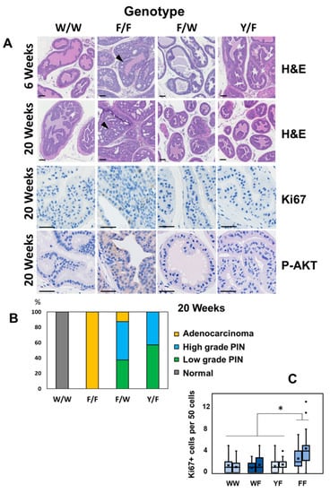 (A) Representative sections of H&E (hematoxylin and eosin) stained prostate tissues from the indicated ages and genotypes of mice. Arrowheads show Prostate Intraepithelial Neoplasia (PIN) in 6-week-old Pten F/F mice and adenocarcinoma in 20 week F/F mice. Ki67 immunohistochemistry was used to detect proliferating cells in 20-week sections and parallel samples were also probed by IHC for AKT phosphorylation (Ser-473). Scale bars: 100 μm. (B) The most aggressive pathology evident in each prostate at 20 weeks of age is noted for each genotype. N = 6 per genotype. (C) The number of Ki67 positive nuclei per 50 cells was counted for 25 regions of the prostate. Data are shown for pairs of mice from the indicated genotypes. Boxes represent quartiles and the cross (x) represents the mean number of proliferative cells per 50 cell group. Each FF sample had significantly more Ki67 positive nuclei than each WW sample (p < 0.05 Mann–Whitney U Test) denoted by *. W/W = Pten+/+; W/F = Pten+/flox; Y/F = PtenY138L/flox; F/F = Ptenflox/flox.