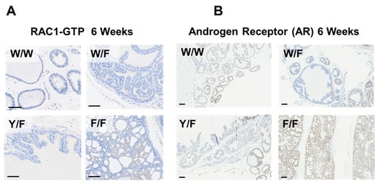 (A) Representative RAC1-GTP abundance in sections of prostate tissues from the indicated Pten mutant genotypes of mice at 6 weeks of age revealed by immunohistochemistry. (B) Representative immunohistochemistry for the Androgen Receptor (AR) in prostates of the indicated genotypes at 6 weeks of age. W/W = Pten+/+; W/F = Pten+/flox; Y/F = PtenY138L/flox; F/F = Ptenflox/flox. Scale bars: 100 μm.