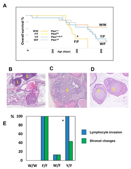 (A) Overall survival of cohorts of the indicated Pten genotype mice is shown. * Statistical analysis by Log Rank (Mantel Cox) test show a significant difference in survival (p < 0.05) between WW vs. FF groups. (B–D) Sections of H&E (hematoxylin and eosin) stained prostate tissues from F/F mice at 20 weeks of age which illustrate the lymphocyte invasion (L) and stromal changes (S) observed in many of the mice. (E) The observation of these changes in each prostate at 20 weeks of age is noted for each genotype. N = 6 per genotype. W/W = Pten+/+; W/F = Pten+/flox; Y/F = PtenY138L/flox; F/F = Ptenflox/flox. * 8/8 Y/F mice displayed lymphocyte infiltration, significantly different from the W/F cohort which showed only 1 mouse with lymphocyte infiltration (p < 0.005 Fisher’s exact test).