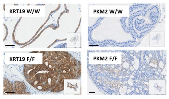 Representative immunohistochemistry showing the abundance of Keratin 19 (KRT19) and Pyruvate Kinase M2 (PKM2) in sections of prostate tissues from wild-type (W/W) and mice conditionally deleted for Pten in the prostate (F/F) at 6 weeks of age. W/W = Pten+/+; F/F = Ptenflox/flox. Scale bars: 50 μm.