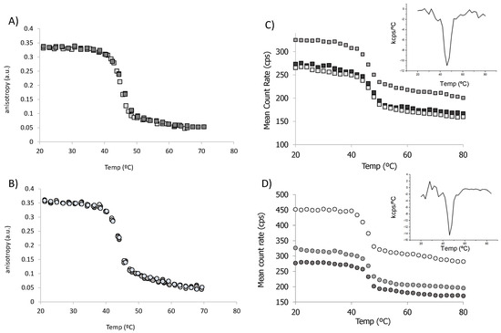 Characterisation of phase transition temperature of PC (A,C) and PC/PE (B,D) liposomes by steady-state fluorescence spectroscopy (A,B) and by dynamic light scattering (C,D). Graphs show DPH anisotropy plot as a function of temperature (A,B)and mean count rate plot as a function of temperature (C,D). Insets in (C,D) show the first-derivative plots of mean count rate/°C across the temperature range. Measurements correspond to independent experiments (n = 3).