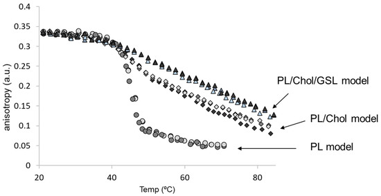 Anisotropy measurements (rs) of DPH fluorescent labelled LUVs across the temperature range of 20 °C to 80 °C, obtained for the phospholipid (PL) model (DPPC/DSPC/DMPE, 0.50:0.28:0.22, circles), the phospholipid/cholesterol (PL/Chol) model (DPPC/DSPC/DMPE/Chol, 0.37:0.21:0.16:0.26, diamonds), and the PL/Chol/GSL model (DPPC/DSPC/DMPE/Chol/GSL, 0.28:0.15:0.16:0.24:0.17, triangles). Measurements in each system correspond to independent experiments (n = 3).