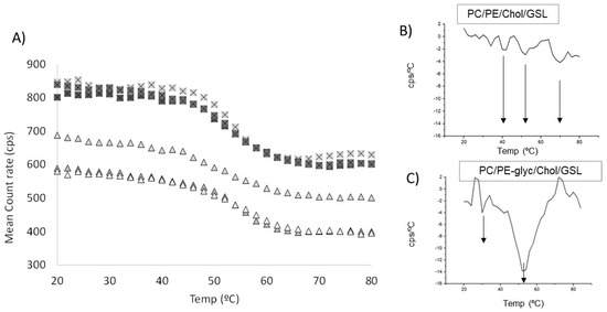 Plots of (A) mean count rate for the epithelial membrane model under normoglycaemia (DPPC/DSPC/DMPE/Chol/GSL, triangles) and hyperglycaemia conditions (DPPC/DSPC/DMPE/DMPE-glyc/Chol/GSL, crossed squares), (B) first-derivative of mean count rate plot under normoglycaemia conditions (PL/Chol/GSL) and (C) first-derivative of mean count rate plot under hyperglycaemia conditions (PL/DMPE-glyc/Chol/GSL). Mean count rate measurements correspond to independent experiments (n = 3).