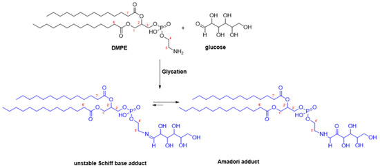 Proposed non-enzymatic reaction of dimyristoyl-glycero-phosphatidylethanolamine (DMPE) and glucose with formation of DMPE-glyc adduct.