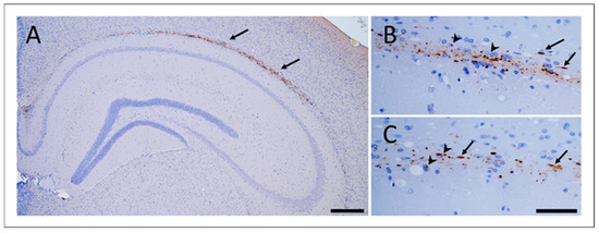 Tau pathology in bank voles inoculated with GSS-F198S. Hyperphosphorylated Tau aggregates in the brain of a BvM culled at 442 d.p.i., inoculated with GSS-F198S #3. Tau inclusions accumulated along the alveus (picture (A), scale bar 200 µm). In pictures (B,C), hyperphosphorylated Tau depositions are shown as neuropil threads (arrows) and coiled bodies (head arrows) (scale bar 50 µm). Immunostaining was performed with AT8 antibody.