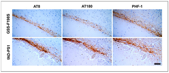 Filamentous Tau pathology in the alveus of BvM inoculated with GSS-F198S and fAD-PS1. Using different anti-Tau antibodies, AT8, AT180, and PHF-1, respectively, against Ser202-Thr205, pT231 and pS396/pS404 epitopes, the same pTau deposition pattern was observed. Scale bar 20 µm.