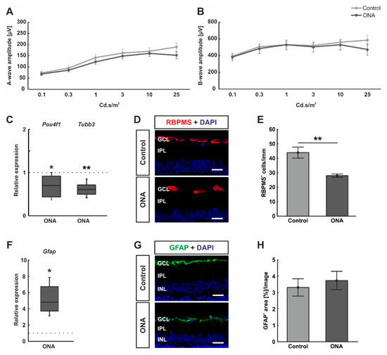 Furthermore, the mRNA expression levels of Pou4f1 and Tubb3 (marker for RGCs) were investigated. We could demonstrate a significant downregulation of Pou4f1 (0.70-fold expression; p = 0.036) and Tubb3 mRNA levels (0.61-fold expression; p = 0.006; Figure 1C) in ONA retinae. Additionally, the number of RGCs was elaborated using a specific anti-RBPMS staining (Figure 2D). A significant decrease of RBPMS+ RGCs was detected in ONA animals (28.08 ± 1.11 cells/mm) compared to controls (43.90 ± 3.81 cells/mm; p = 0.002; Figure 2E).