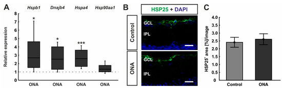 The mRNA expression levels of different HSPs were examined by RT-qPCR analyses. The relative expression of Hspb1 (HSP27) was significantly upregulated in ONA retinae (2.69-fold expression; p = 0.036). In addition, the mRNA expression of Dnajb1 (HSP40; 2.53-fold expression; p = 0.038) and Hspa4 (HSP70; 2.59-fold expression; p < 0.001) were upregulated in ONA animals compared to controls. Hsp90aa1 (HSP90) mRNA expression, on the other hand, was not altered after ONA immunization (1.33-fold expression; p = 0.102; Figure 3A).