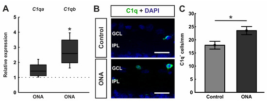 Enhancement of classical pathway components. (A) RT-qPCR analyses revealed a trend towards an upregulation in the mRNA expression levels of C1qa in ONA retinae (p = 0.052), while a significant upregulation of C1qb mRNA expression levels was detected in ONA animals (p = 0.037). (B) A C1q antibody was applied to retinal cross-section (green). DAPI counterstained cell nuclei (blue). (C) We noted significantly more C1q+ cells in the GCL of ONA animals compared to controls (p = 0.023). Scale bars: 20 µm. GCL = ganglion cell layer; IPL = inner plexiform layer. Values for RT-qPCR are median ± quartile ± minimum/maximum and values for immunofluorescence are mean ± SEM. The dotted line in (A) represents the relative expression of the control group. * p < 0.05.