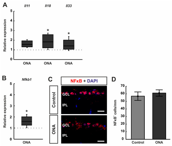 Additionally, RT-qPCR analyses of mRNA levels of the transcription factor Nfkb1 revealed a significant upregulation in the ONA retinae (1.59-fold expression; p = 0.012; Figure 5B).