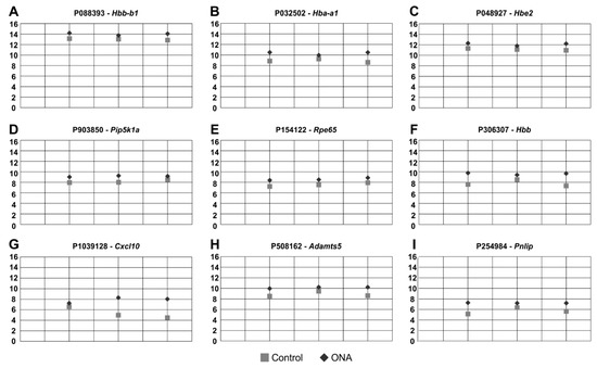 Based on the results of the microarray assays, we performed additional RT-qPCR analyses of the most up- and downregulated genes (p < 0.05). Amongst others, Hba-a1 (p = 0.006), Hbe2 (p = 0.009), and Cxcl10 (p = 0.039) were found upregulated in the ONA retinae in the microarray analysis.