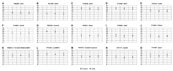 Downregulated regulated oligonucleotide probes. (A–O) The 15 oligonucleotide probes found downregulated in ONA rats following microarray analysis of the inner retinal layers. All plots display the normalized fluorescence intensity (y-axis) of ONA and control animals (x-axis).