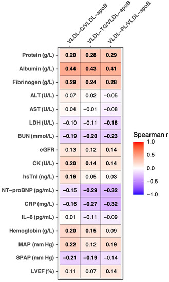 After applying a Bonferroni correction for testing multiple parameters, VLDL-C/VLDL-apoB, VLDL-TG/VLDL-apoB, and VLDL-PL/VLDL-apoB were significantly (p < 0.017) positively correlated with total serum protein, albumin, fibrinogen, and CK, as well as significantly negatively with BUN, NT-proBNP, and CRP (Figure 1). Furthermore, while both VLDL-C/VLDL-apoB and VLDL-TG/VLDL-apoB were significantly positively correlated with hemoglobin and significantly negatively correlated with systolic pulmonary artery pressure, both VLDL-C/VLDL-apoB and VLDL-PL/VLDL-apoB were significantly positively correlated with MAP. Additionally, VLDL-C/VLDL-apoB was significantly positively correlated with hsTnI, whereas VLDL-PL/VLDL-apoB was significantly positively correlated with eGFR and LVEF, as well as negatively with LDH. Neither ratio was significantly correlated with ALT, AST, or IL-6 (Figure 1).