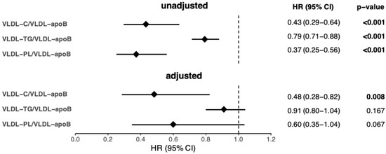 VLDL-C/VLDL-apoB, VLDL-TG/VLDL-apoB, and VLDL-PL/VLDL-apoB were significantly associated with 1 year mortality in the univariable Cox regression analyses. However, only the association of VLDL-C/VLDL-apoB remained significant after adjustment for age, sex, and the clinical and laboratory parameters significantly associated with 1 year mortality in the univariable analyses shown in Table S2 (Figure 2).