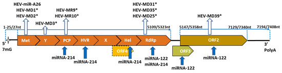 In addition to viral transcripts, HEV produced several different miRNAs. Till now, their study has mainly been based on prediction in silico models confirmed by in vitro or in vivo experimental infectious models. At present, these studies are hampered by the absence of a suitable infectious model, as HEV replicates slowly in cell-cultured systems, leading to virus adaptation [53].