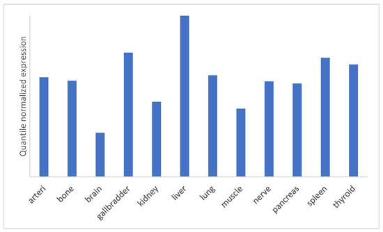 Expression plot of miR-122 in different organs. The expression of miRNA within different organs was calculated by tissue specificity index (TSI). Adapted from the tissue atlas [https://ccb-web.cs.uni-saarland.de/tissueatlas/ (accessed on 28 August 2022); [32]]. The maximum expression value for selected human organs is visualized. For best visualization, the quantile normalized expression is represented in the decimal logarithmic scale.