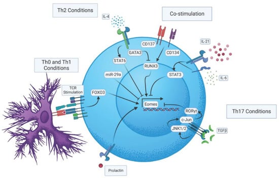 T-bet and Eomes regulate genes by binding to specific T-box binding sites. Both IL17A and RORC have T-box binding sites in their promoter thus enabling Eomes to directly repress Th17 development [,,]. Th17 polarization is directed by cytokines including IL-21, IL-23, IL-6 and TGF-β. The addition of these signals was found to reduce Eomes expression during in vitro Th17 development, while, on the other hand, ectopic Eomes expression was shown to abrogate Th17 development, further establishing a role for Eomes as a Th17 repressor [,,]. It is important to note that the loss of Eomes alone in CD4 T cells does not result in ‘default’ increases in IL-17 production, as shown in studies utilizing Experimental Autoimmune Encephalomyelitis (EAE), the murine model of Multiple Sclerosis (MS) []. Thus, while inhibiting Eomes expression may be a critical first step for optimal Th17 development, it is not sufficient to promote Th17 polarization in the absence of other key inflammatory signals.