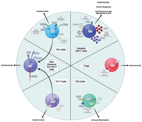 Aberrant CD4 T cell responses are associated with multiple immunopathologies, but they are also critical components of protective immune responses against cancers and pathogens [,]. Figure 2 broadly indicates the most relevant disease states that Eomes expression in CD4 T cells has been found to impact, linking them to functional ties with Eomes discussed earlier.