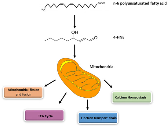 4-HNE generated after peroxidation of n-6 fatty acid affects various aspects of mitochondrial function such as electron transport chain, TCA cycle, mitochondrial fission, mitochondrial fusion, and calcium homeostasis.