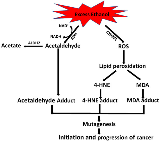Schematic representation of 4-HNE-induced carcinogenesis due to chronic alcoholism. Chronic/high levels of alcohol consumption cause significant changes in alcohol metabolism by additional activation of CYP2E1, which metabolizes alcohol and produces acetaldehyde as well as ROS. ROS increase lipid peroxidation, leading to the production of the toxic end products 4-HNE and MDA. Increased levels of acetaldehyde, 4-HNE, and MDA react with DNA bases, leading to the production of the carcinogenic adduct, which, subsequently, causes mutation of certain genes, resulting in the initiation and progression of cancer.