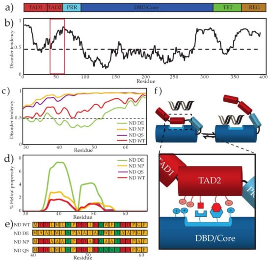 p53’s DNA binding affinity is regulated by an autoinhibitory intramolecular interaction between the disordered N-terminal transactivation domain (TAD) and the ordered DNA binding domain (DBD), resulting in a lowered DNA binding affinity and an increase in specificity for target DNA [22,23]. As shown in Figure 1a,b, the domain structure of p53 is defined as a TAD that is further divided into TAD1 (1–39) and TAD2 (40–60), followed by a proline rich region (PRR, residues 61–93), a DNA-binding or Core domain (94–292), a linker (293–322), a tetramerization domain (TET, residues 323–355), and regulatory domain (REG, residues 356–393).