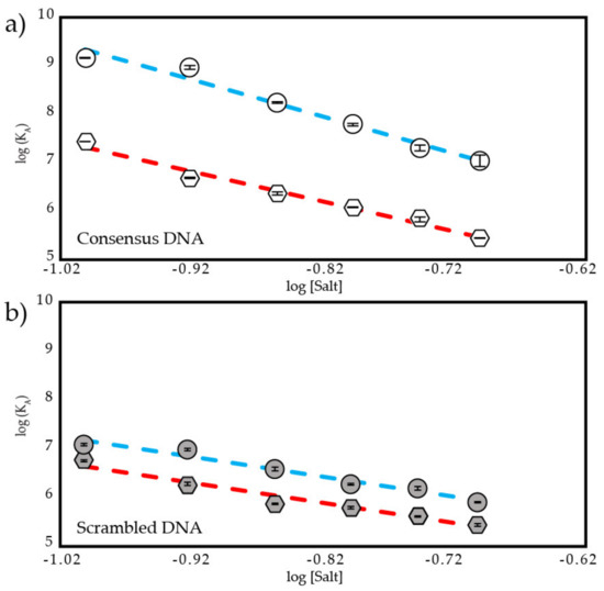 Salt-dependent binding affinity of DBD and ND WT. Plot of log (KA) vs. log [Salt] from 125–225 mM IS of (a) DBD and ND WT binding to consensus DNA where