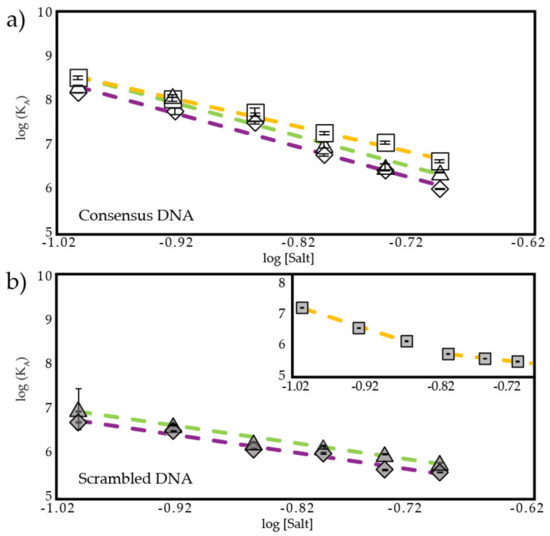 Salt-dependent binding affinity of ND mutants. Plot of log (KA) vs. log[Salt] from 125–225 mM IS of (a) ND mutants binding consensus DNA, where
