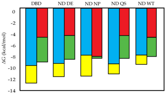 We find that the intramolecular interaction between the TAD2 and DBD domains of p53 is disrupted by mutations targeting multiple types of interactions. Alanine substitutions of TAD2’s negatively charged residues, ND DE, increased consensus DNA free energy of binding by −1.99 kcal/mol relative to ND WT, suggesting that electrostatics play a large role in the intramolecular interaction and autoinhibition of DNA binding. Alanine substitutions of nonpolar residues, ND NP, increased DNA free energy of binding by −1.89 kcal/mol, suggesting a nonelectrostatic component. A targeted substitution of W53/F54 to Q53/S54, ND QS, chosen because of its established ability to disrupt other important TAD2 interactions [66,67,68], increases consensus DNA free energy of binding by −1.49 kcal/mol. The sum of the effects of the ND DE and ND NP mutants on the autoinhibition of DNA binding is 1 kcal/mol greater than the effect of ND WT. This indicates some cooperativity between the acidic, nonpolar, and aromatic residues of TAD2 to inhibit DNA binding.