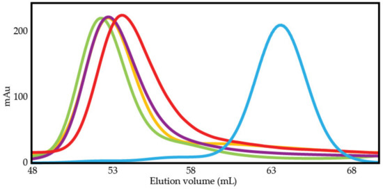 - Kunji, E.R.; Harding, M.; Butler, P.J.G.; Akamine, P. Determination of the molecular mass and dimensions of membrane proteins by size exclusion chromatography. Methods 2008, 46, 62–72. [Google Scholar] [CrossRef]