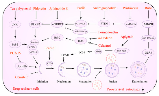 Recently, NPs derived from plants have shown unique advantages in the management of cancer, particularly in the battle against drug resistance [54,55]. Reviewing the literature revealed that a subset of NPs causes apoptosis in tumor cells by suppressing pro-survival autophagy. A subset of NPs promotes toxic autophagy, which causes autophagic cell death. More intriguingly, certain NPs may both trigger toxic autophagy and suppress pro-survival autophagy. We are thus interested in the mechanism of action of NPs against drug resistance in tumors through the modulation of autophagy.