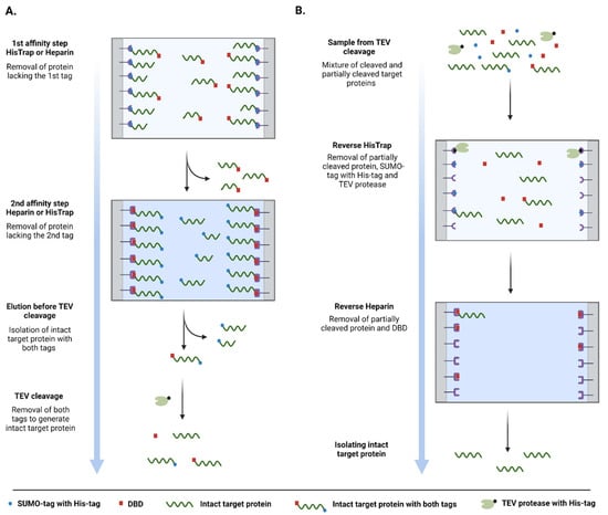 Schematic representation of the workflow of the tandem-tag purification method. (A) Representation the first two affinity steps before TEV cleavage. (B) Representation the reverse affinity steps after TEV cleavage. (Figure was created with BioRender.com).