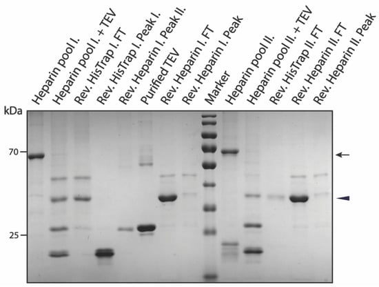 Upon partial proteolytic degradation, one of the two termini is truncated, which leads to the malfunction of the tag at the affected termini. By applying two subsequent affinity steps (HisTrap and Heparin), we could ensure that only the intact protein is isolated from a bacterial cell lysate. Following successful isolation, both tags can be simultaneously removed in a single TEV protease cleavage step (Figure 2A). As the TEV protease also carries a fused 6xHis-tag at its N-terminus, the free 6xHis-SUMO-tag, uncleaved target proteins and the protease can be simultaneously removed by a reverse HisTrap purification step (Figure 2B). Reverse Heparin purification acts as a final polishing step. Moreover, since the flow-through is collected in these last steps, non-specifically binding contaminants are also going to re-bind to the columns, further improving the overall purity of the final product.