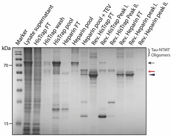 SDS-PAGE summarizing pSUMO-Tau-NTMT purification. The black arrow indicates intact Tau-NTMT with both affinity tags, the red arrow indicates Tau-NTMT with a DBD-affinity tag at its C-terminus and the black triangle indicates the fully cleaved Tau-NTMT product.