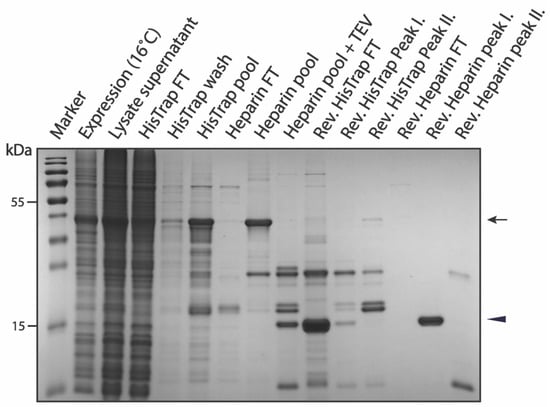 The production of recombinant proteins is a crucial technique in both academic research and industrial applications []. In industry, such as the pharma sector, the use of biopharmaceuticals is becoming the dominant trend. In the last few years, close to 100 new biopharmaceuticals, the majority being recombinant proteins, have entered the market []. In molecular biology, recombinant protein purification is a vital technique for a broad range of applications, such as structural characterization by X-ray crystallography, nuclear magnetic resonance (NMR), small-angle X-ray scattering (SAXS) and cryo-electron microscopy (cryo-EM) [,,]. Most of these require large quantities of protein with high quality, although cryo-EM is less stringent on sample requirement following its compatibility with protein purified from native samples []. Besides protein structure technologies, other in vitro biochemical studies and molecular biology applications also require protein of good quality and reasonable quantity. Therefore, significant effort is directed towards developing new and improved purification approaches [,,].