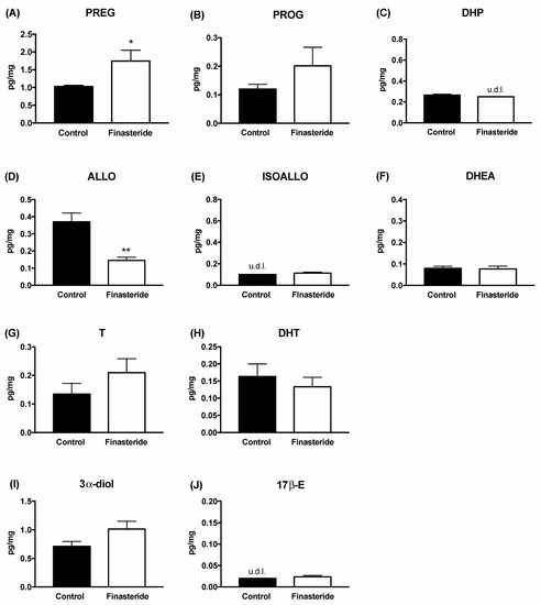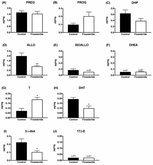 Levels of gut steroids in the colon of the control (black bar) and finasteride-treated (white bar) rats: effect after treatment. Pregnenolone (PREG, (A)), progesterone (PROG, (B)), dihydroprogesterone (DHP, (C)), allopregnanolone (ALLO, (D)), isoallopregnanolone (ISOALLO, (E)), dehydroepiandrosterone (DHEA, (F)), testosterone (T, (G)), dihydrotestosterone (DHT, (H)), 5α-androstane-3α, 17β-diol (3α-diol, (I)) and 17beta-estradiol (17β-E, J). Data are expressed as pg/mg ± SEM, n = 6 for each group. Unpaired Student’s t-test analysis: * p < 0.05, ** p < 0.01 vs. control rat colon. U.d.l. = under the detection limit. Detection limits were 0.05 pg/mg for dehydroepiandrosterone, 0.1 pg/mg for isoallopregnanolone and 0.02 pg/mg for 17β-Estradiol.
