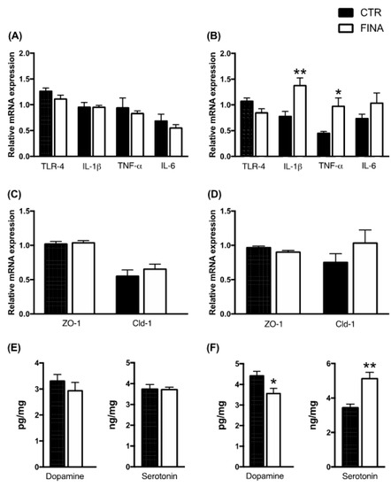 Gene expression of pro-inflammatory markers (A,B); gut permeability markers (C,D) detected by real-time PCR in colon of controls (CTR) and finasteride-treated rats (FINA) after drug treatment (A,C) and at withdrawal (B,D). The columns represent the mean ± SEM after normalization with 36B4 mRNA, n = 6 for each group. Levels of dopamine and serotonin (E,F) detected by LC-MS/MS in the colon of controls and finasteride-treated rats after drug treatment (E) and at withdrawal (F). Data are expressed in pg/mg or ng/mg ± SEM, n = 6 for each group. The unpaired Student’s t-test was used for statistical * p < 0.05, ** p < 0.01 vs. control group.