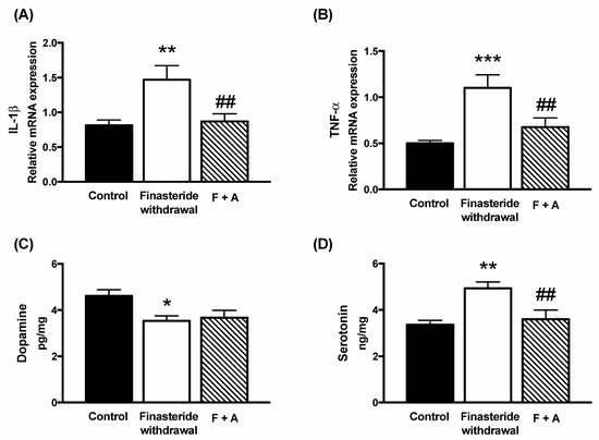 Gene expression of IL-1β (A) and TNF-α (B) detected by real-time PCR in the colon of controls, finasteride-treated rats and ALLO-treated rats after drug withdrawal (F + A). The columns represent the mean ± SEM after normalization with 36B4 mRNA. Levels of dopamine (C) and serotonin (D) were detected by LC-MS/MS in the colon of controls, finasteride-treated rats and ALLO-treated rats after drug withdrawal. Data are expressed in pg/mg or ng/mg ± SEM, n = 7 for each group. The effect of treatment of ALLO was analyzed using one-way ANOVA followed by Uncorrected Fisher’s LSD post hoc test (significance: * p < 0.05; ** p < 0.01; *** p < 0.001 vs. control group; ## p < 0.01 vs. finasteride-treated rats).