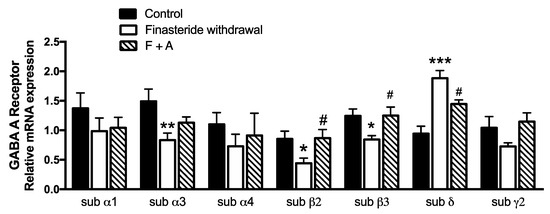 Gene expression of GABA-A receptor subunits α1, α3, α4, β2, β3, δ and γ2 in the colon of controls, finasteride-treated rats and ALLO-treated rats after drug withdrawal. The columns represent the mean ± SEM after normalization with 36B4 mRNA, n = 7 for each group. The effect of treatment of ALLO was analyzed using one-way ANOVA followed by Uncorrected Fisher’s LSD post hoc test (significance: * p < 0.05, ** p < 0.01, *** p < 0.001 vs. control group; # p < 0.05 vs. finasteride-treated rats).