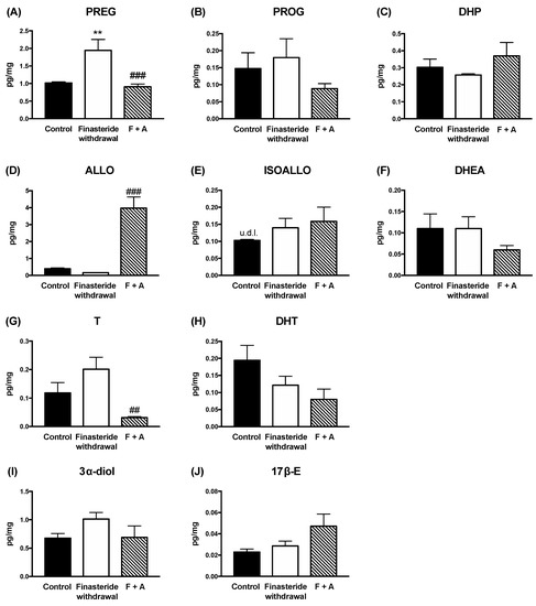 Levels of gut steroids in the colon of control, finasteride-treated rats and ALLO-treated rats: effect at withdrawal (F + A). Pregnenolone (PREG, (A)), progesterone (PROG, (B)), dihydroprogesterone (DHP, (C)), allopregnanolone (ALLO, (D)), isoallopregnanolone (ISOALLO, (E)), dehydroepiandrosterone (DHEA, (F)), testosterone (T, (G)), dihydrotestosterone (DHT, (H)), 5α-androstane-3α, 17β-diol (3α-diol, (I)) and 17beta-estradiol (17β-E, (J)). Data are expressed as pg/mg ± SEM, n = 7 for each group. The effect of treatment with ALLO was analyzed using one-way ANOVA followed by Uncorrected Fisher’s LSD post hoc test (significance: ** p < 0.01 vs. control group; ## p < 0.01; ### p < 0.001 vs. finasteride-treated rats). u.d.l. = under the detection limit. The detection limit was 0.1 pg/mg for isoallopregnanolone.