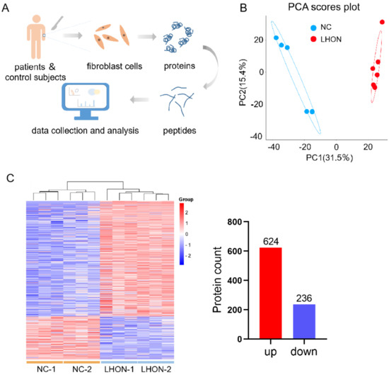Proteome overview of LHON fibroblasts (m.G11778A). (A) The strategy of this study. Scattered fibroblasts were isolated from skin tissue obtained from LHON patients bearing m.G11778A and control subjects. Peptides were extracted after cell lysis, and then proteomic and bioinformatics analyses were performed. (B) PCA of total proteins between fibroblasts of LHON and control. (C) Heatmap plot showing DEPs (differential expression proteins) between fibroblasts of LHON and control. A total of 860 DEPs were identified, including 624 upregulated proteins (FC ≥ 1.2, p ≤ 0.05) and 236 downregulated proteins (FC ≤ 1.2, p ≤ 0.05).