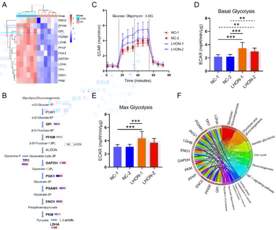 Increased glycolysis level in LHON fibroblasts (m.G11778A). (A) Clustered heatmap displaying expression of DEPs participated in glycolysis. (B) Flowchart showing glycolysis process. DEPs are emphasized in bold, and the color scale indicates the expression level. (C) ECAR (extra-cellular acidification rate) of fibroblasts was measured using XFe96 seahorse analysis. The basal (D) and max (E) ECAR values were calculated. ** p ≤ 0.05, *** p ≤ 0.01. (F) GO chord plot showed different pathways involved in glycolysis DEPs.