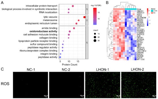 Next, we performed GO annotations on the downregulated DEPs. The results showed that the lytic vacuole (CC, n = 37), intracellular protein transport (BP, n = 28) and oxidoreductase activity (MF, n = 27) had high enrichments (Figure 5A). In addition to energy metabolism regulation, mitochondrion also participated in redox reactions [25,28]. Thus, mitochondria dysfunction in LHON fibroblasts may lead to reduced oxidoreductase activity. The proteins enriched in oxidoreductase activity were listed in Figure 5B, and the expression was all significantly downregulated. As ROS is a product of dysregulated redox reactions, we detected the ROS level to clarify the changes in redox reactions. The results showed higher ROS in LHON fibroblasts compared to the control cells, indicating dysregulation of redox reactions (Figure 5C). The results were consistent with previous studies [29,30,31] and manifested the reliability of the data further.